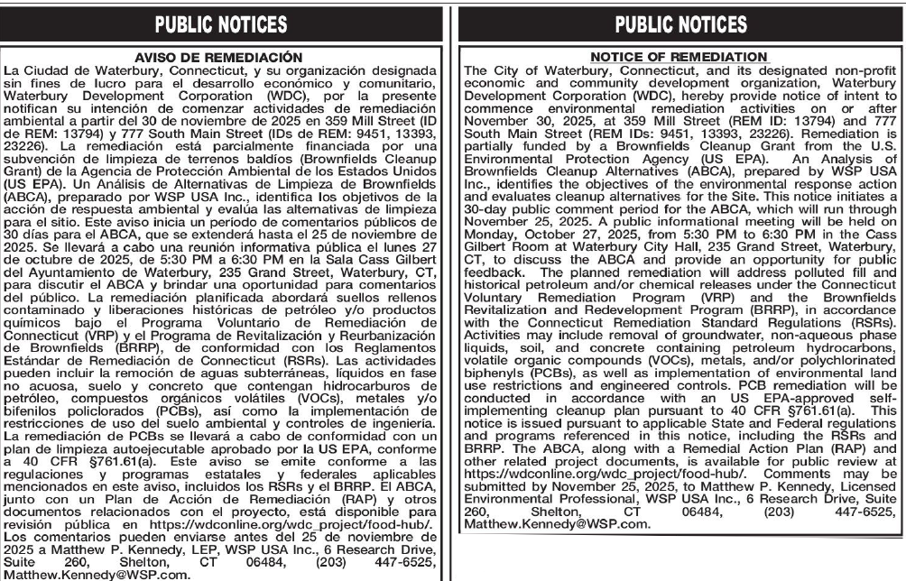 A public informational meeting will be held on Monday, October 27, 2025 from 5:30pm to 6:30pm in the Cass Gilbert Room at Waterbury City Hall to discuss the ABCA and provide an opportunity for public feedback.